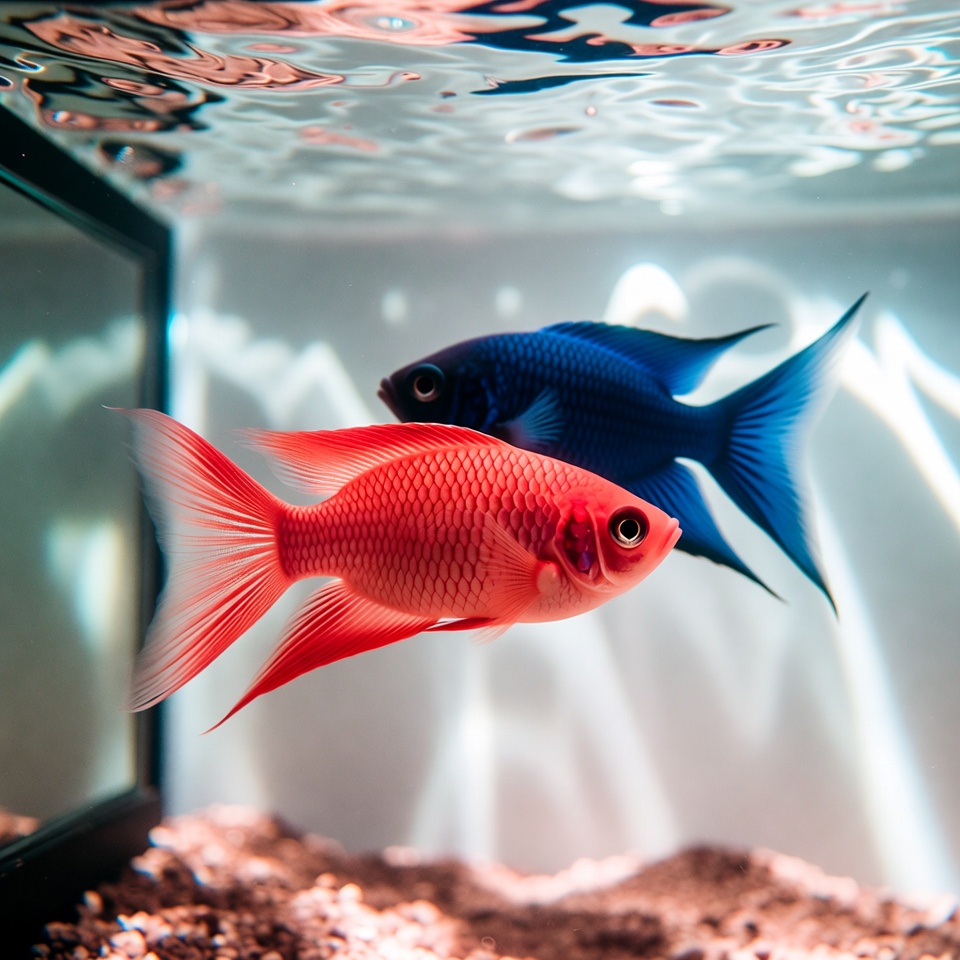 Two fish are swimming in a clear aquarium. One fish is bright red while the other is vibrant blue. The water reflects light.