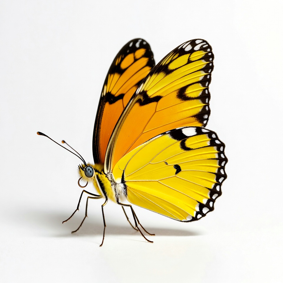 A butterfly with yellow and black wings sits on a white surface. Its wings display detailed patterns as it rests quietly.