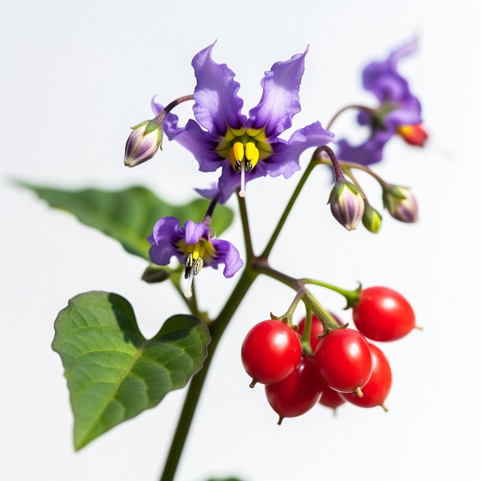 A purple flower grows alongside bright red berries in a garden during spring. The scene captures the plant's beauty and color.