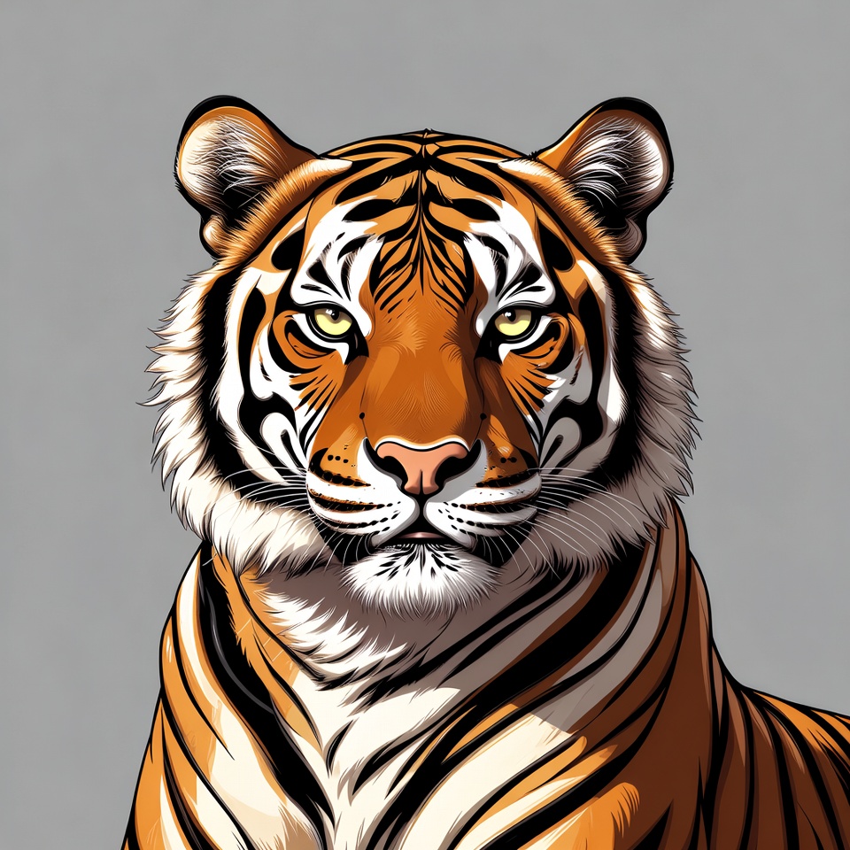A tiger is looking directly at the viewer. Its fur shows distinct stripes and facial features. The background is gray.