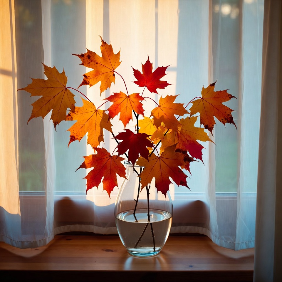 Bright autumn leaves in a clear vase placed on a wooden table near a window with soft light shining through.