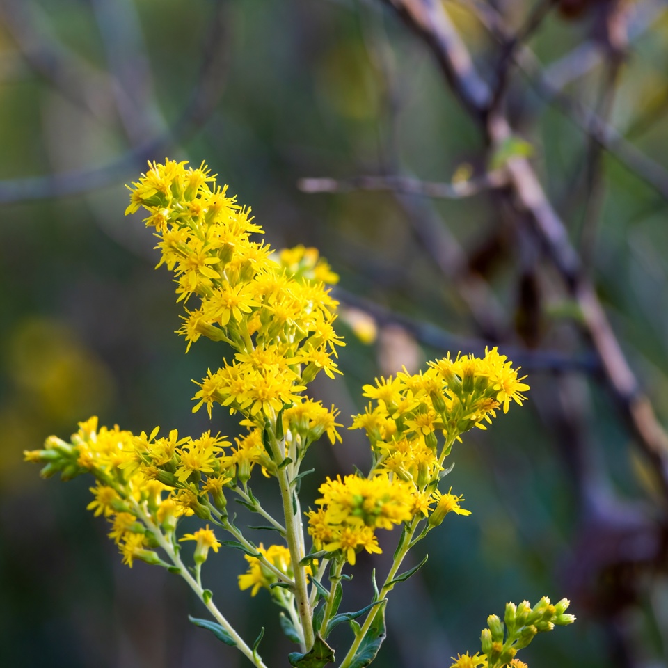 Bright yellow flowers bloom in a natural setting during daytime. Green leaves surround the flowers. Background includes twigs and blurred plants.