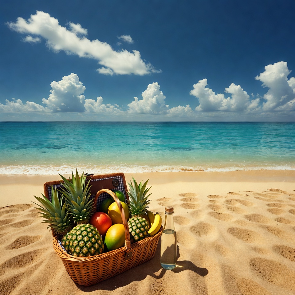 basket, beach, blue sky, fruits, horizon, leisure, nature, ocean, outdoor, picnic, pineapples, relaxation, sand, summer, sun, travel, tropical, vacation, water, waves