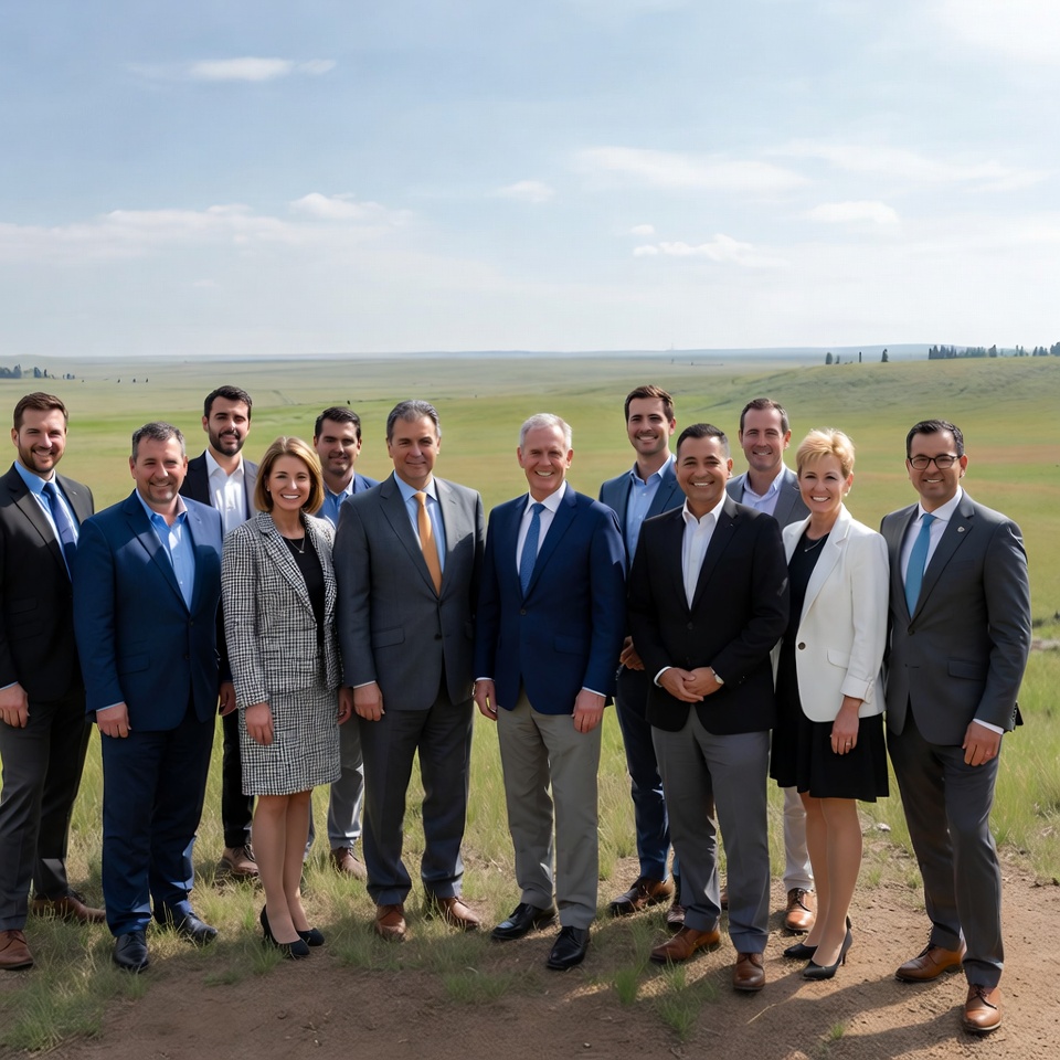 blue sky, clear day, community, event, field, gathering, grass, group, landscape, leaders, meeting, men, nature, outdoors, people, poses, professional, smiles, teamwork, women