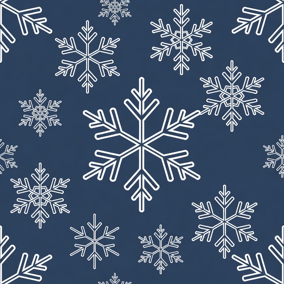 White snowflakes of various sizes appear on a dark blue background. The snowflakes have simple patterns and evenly spaced designs.