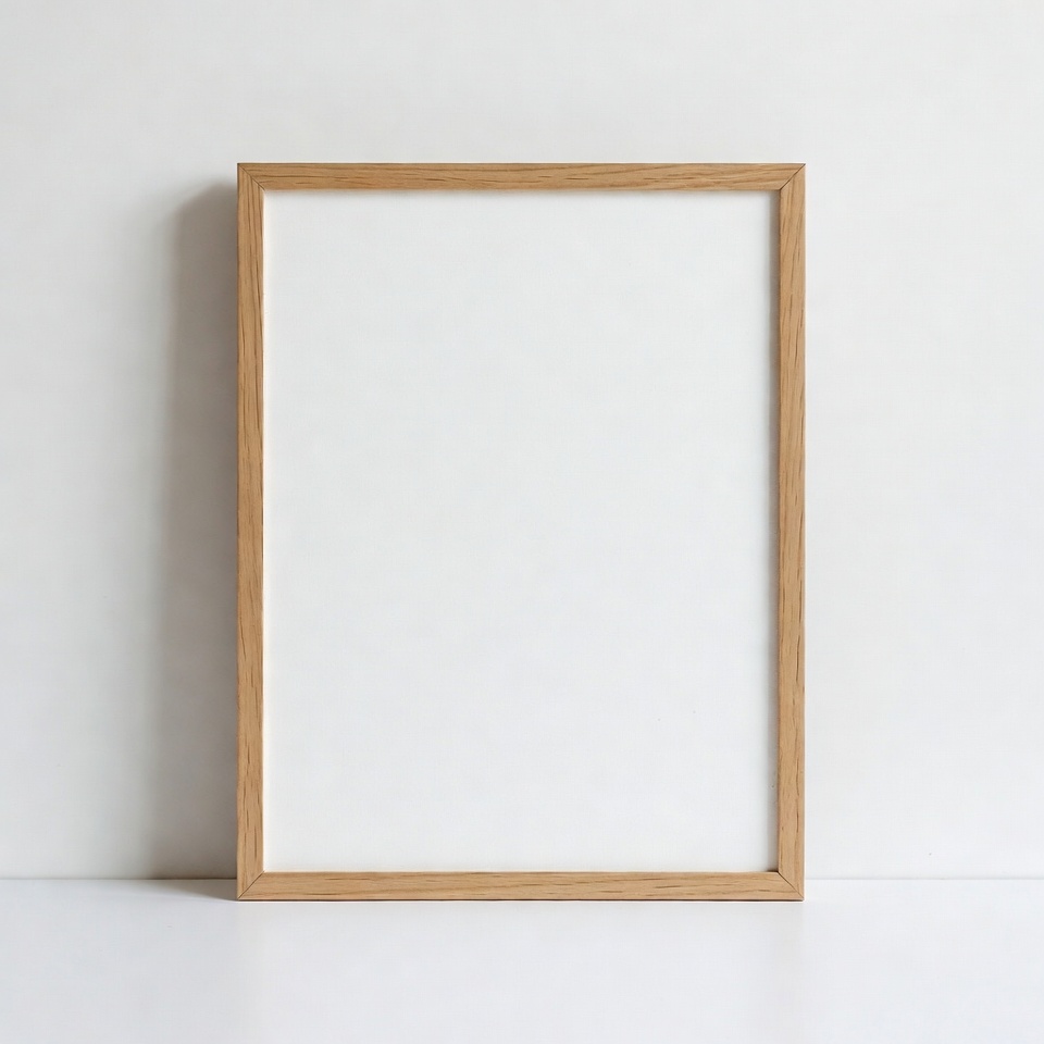 An empty wooden frame stands against a plain white wall. The scene is simple and minimalistic, presenting a blank canvas for creativity.