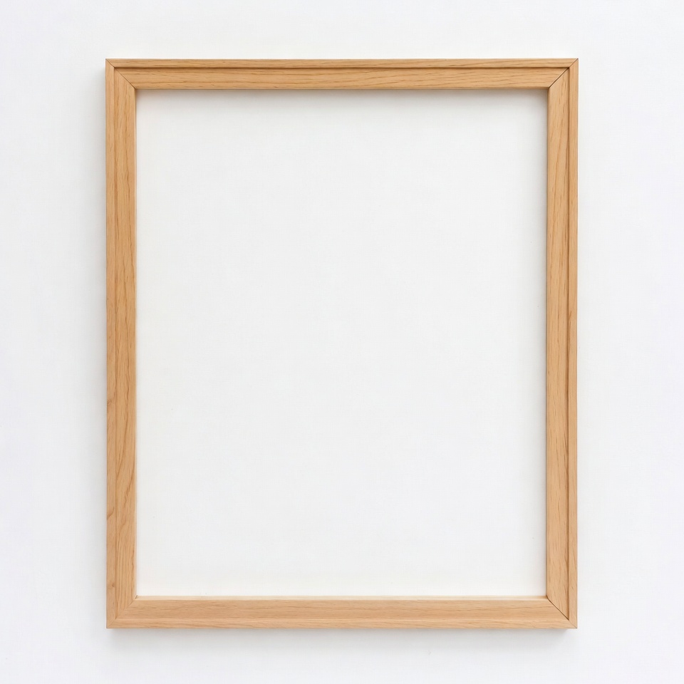 A wooden frame sits against a white wall waiting to hold a picture or artwork. The frame is simple with a light wood finish.