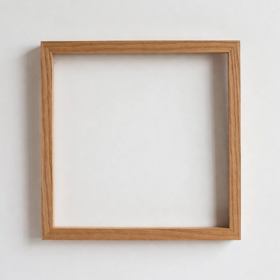 A simple wooden frame sits empty against a white wall, waiting for a picture or art to be added for display or decoration.
