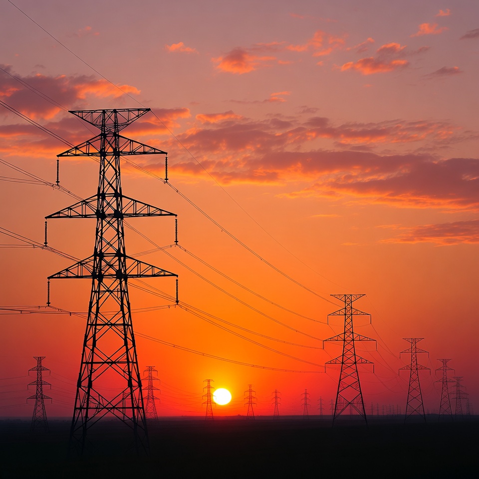Power lines stretch across the landscape as the sun sets in the distance, creating a colorful sky with clouds and silhouettes.