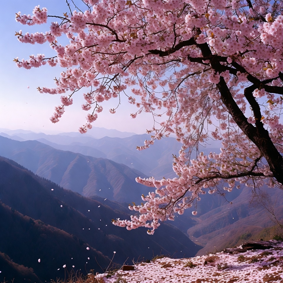 Cherry blossom tree stands on a hillside overlooking mountains during spring. Pink petals drift down in the clear sky.