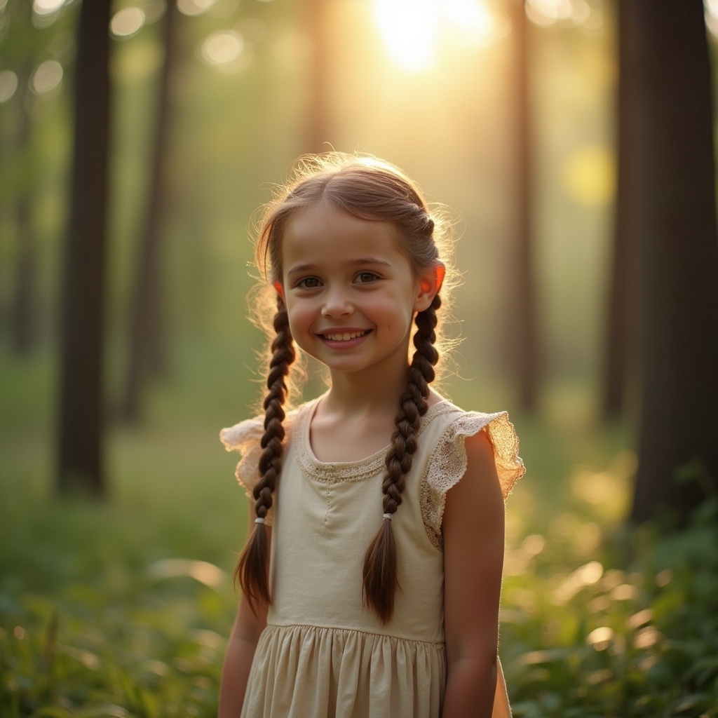 A girl stands in a forest, smiling with two braids. Sunlight shines through the trees, creating a warm scene.
