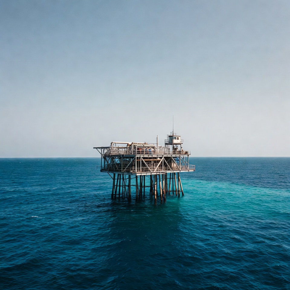 A large platform stands in the ocean, surrounded by blue water. The sky is clear and it is daytime.