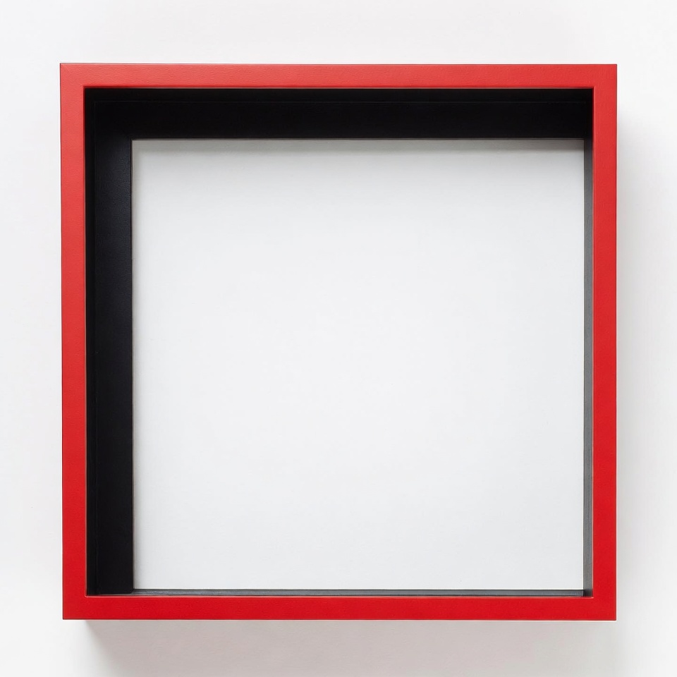 A red and black display box hangs on a white wall. The box is empty and has a square shape. It stands out with its bold colors.