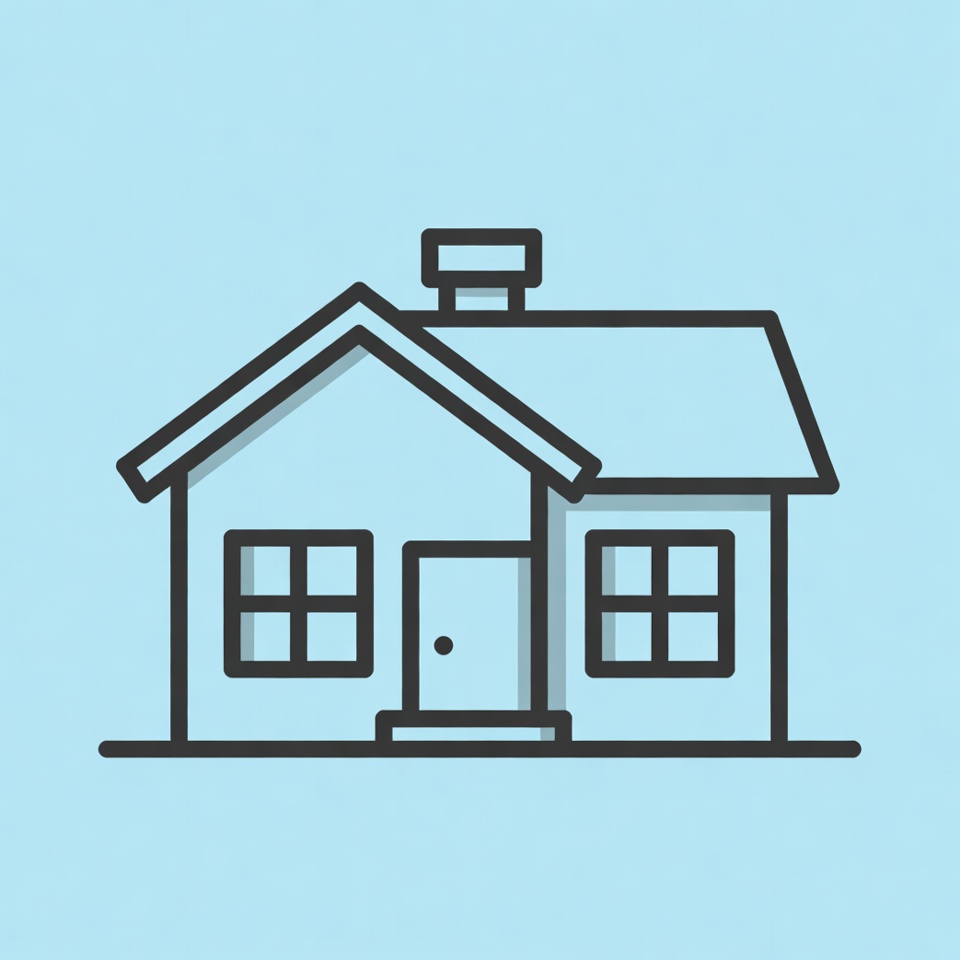A basic outline of a house is displayed on a blue background, showing windows, a door, and a chimney without extra details.