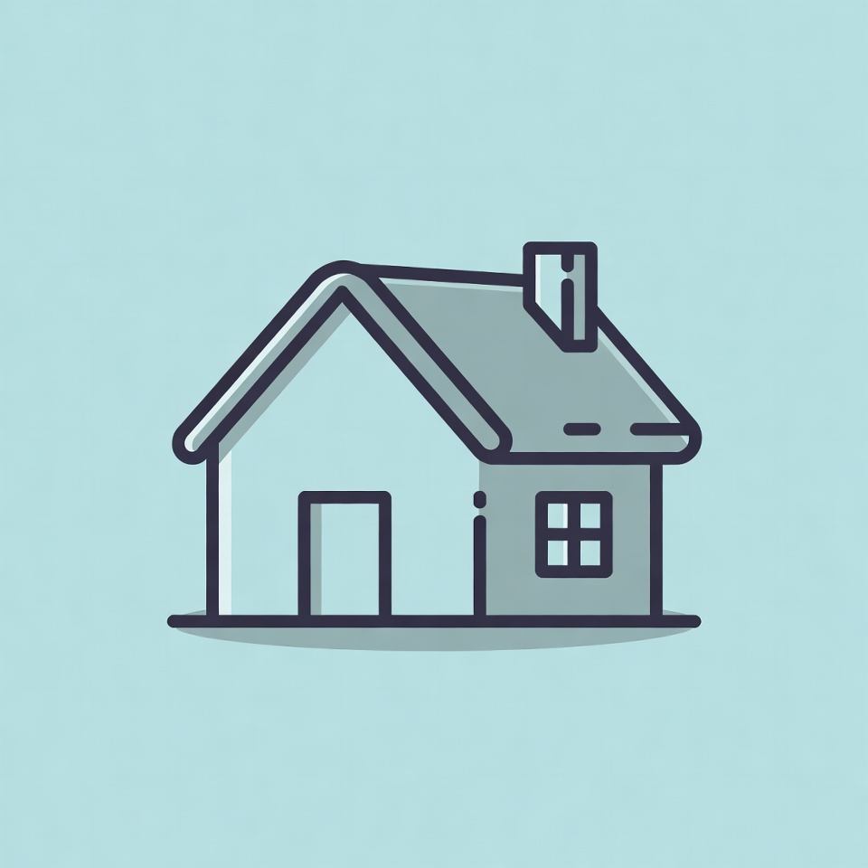 A house illustration shows a small building with a chimney and window. It has a minimalist design on a light background.