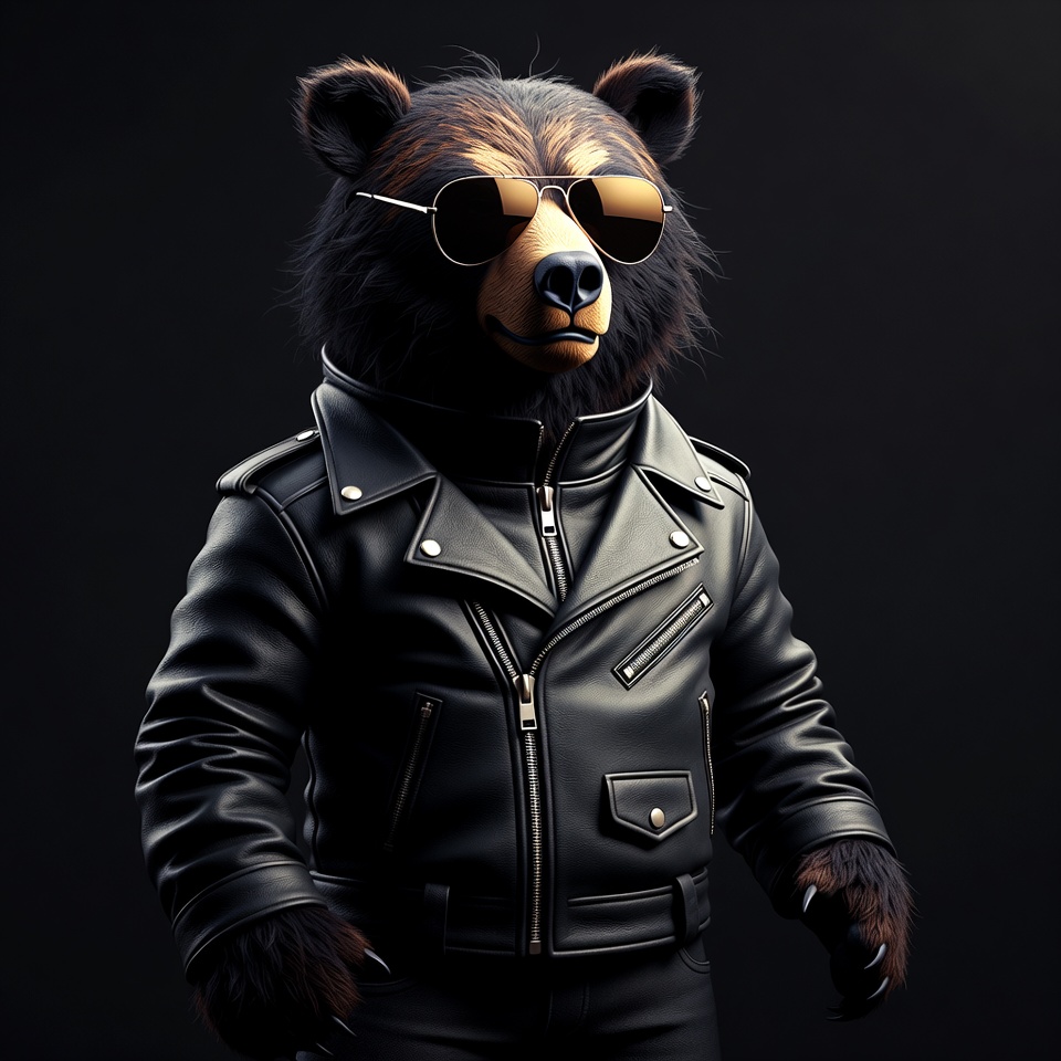 A bear stands confidently, wearing sunglasses and a leather jacket. The background is dark, highlighting the bear's outfit and stance.