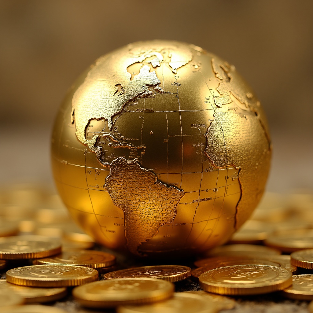 A gold globe is placed on top of coins, showcasing continents. The scene emphasizes wealth and the global economy.