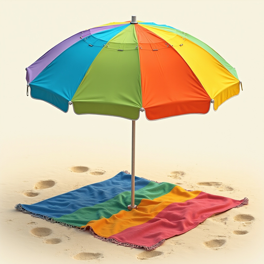 A beach umbrella sits on a sand surface, offering shade. A colorful blanket is placed below the umbrella, inviting relaxation during the day.
