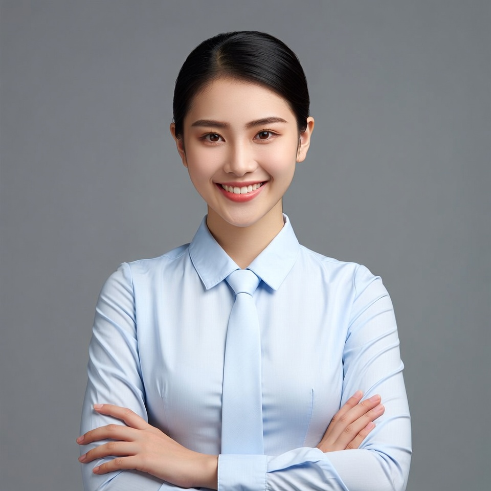 Asian woman, arms crossed, background, black hair, business, clothing, confidence, facial expression, fashion, hairstyle, happy, portrait, professional, smiling, social, studio, tie, woman, workplace, young adult