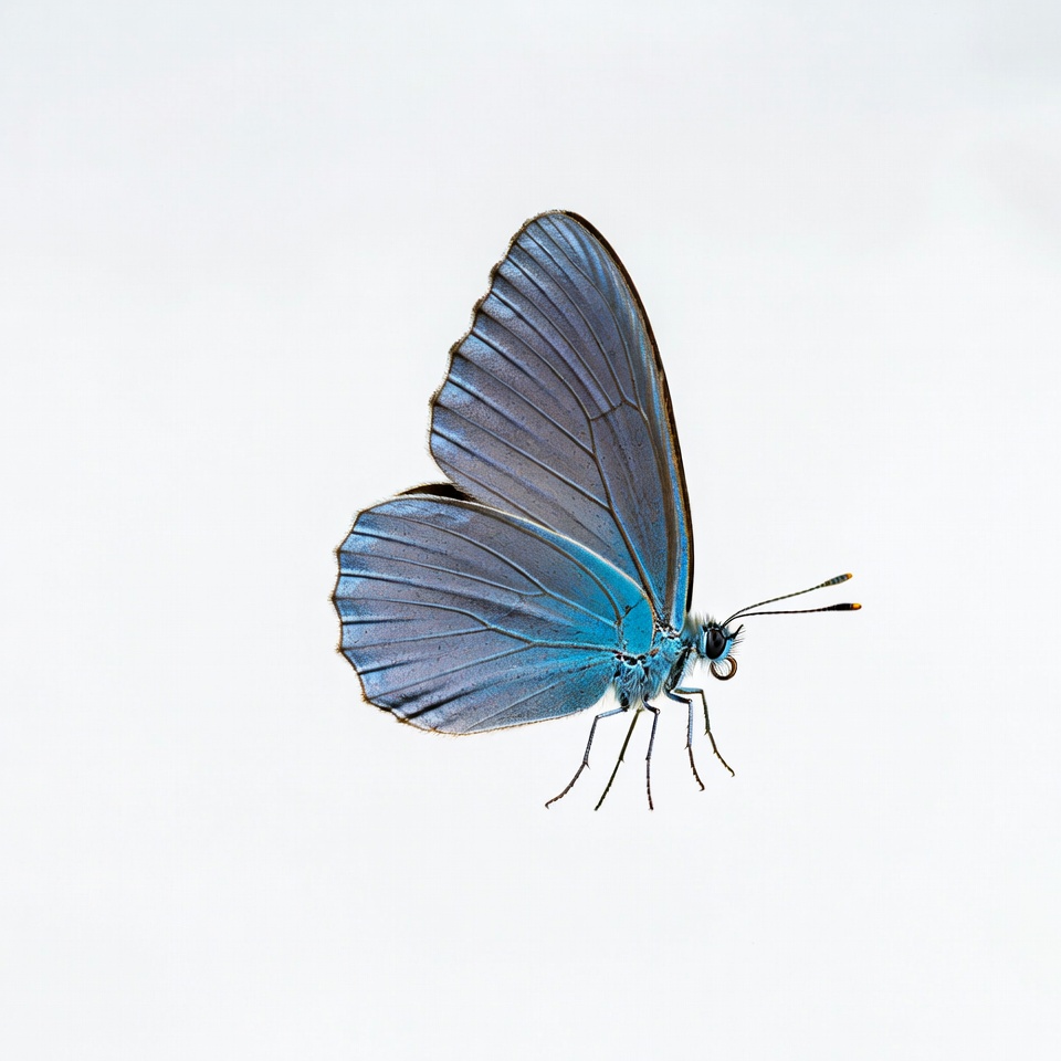 A blue butterfly is flying against a white background. The wings are open, showing vibrant colors and delicate features in a natural setting.