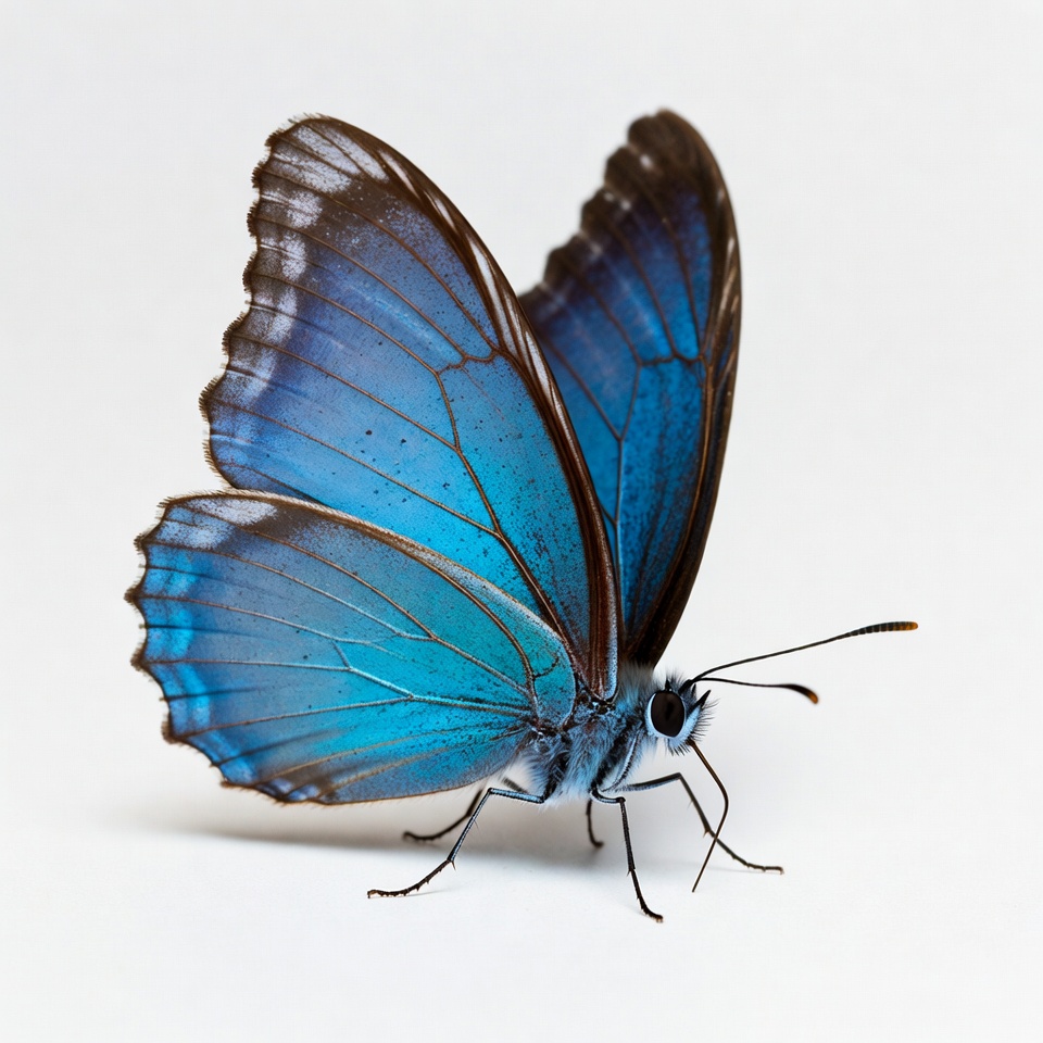 A blue butterfly rests with wings open, showcasing its vibrant color and unique patterns. It stands on a light surface, ready to take flight.