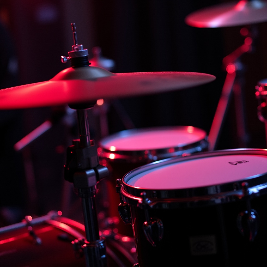 A drummer plays in a dimly lit space. Red lights shine on the drums, creating an energetic atmosphere during the practice.