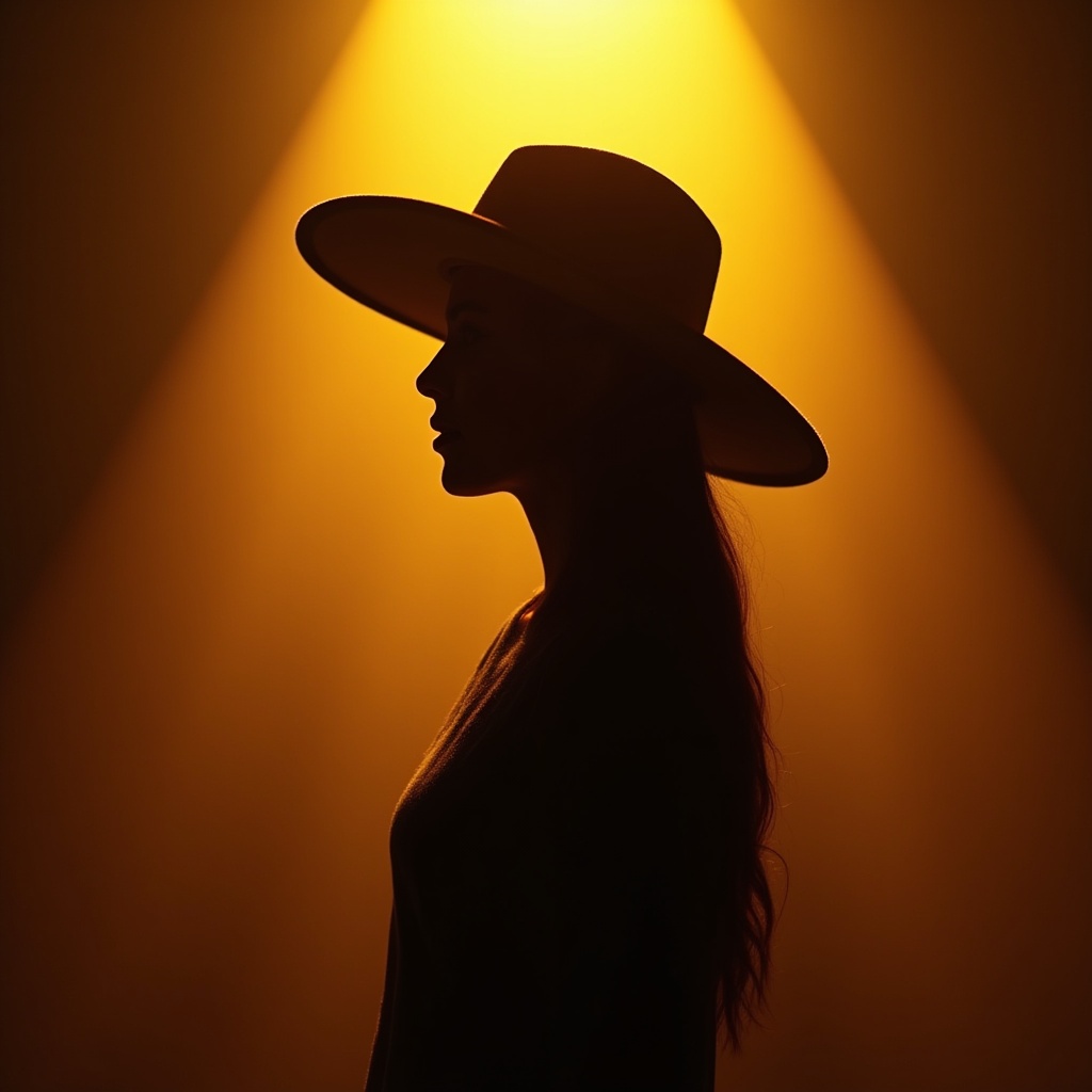 A woman stands in profile wearing a hat, illuminated by a yellow light. The setting creates a striking silhouette against the backdrop.