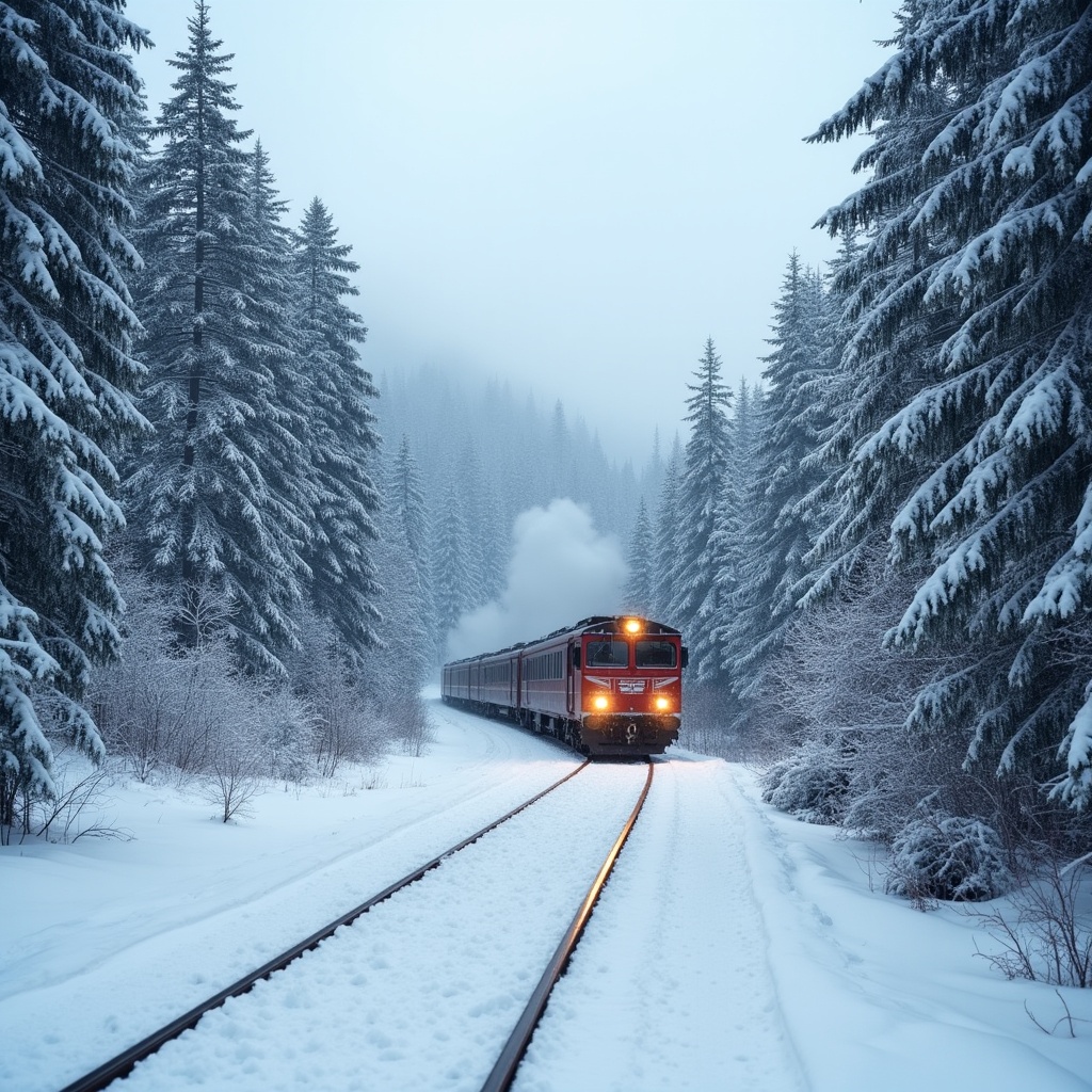 A train moves along tracks in a snowy forest. Tall trees surround the scene, covered in snow. It is winter and the air is cold.
