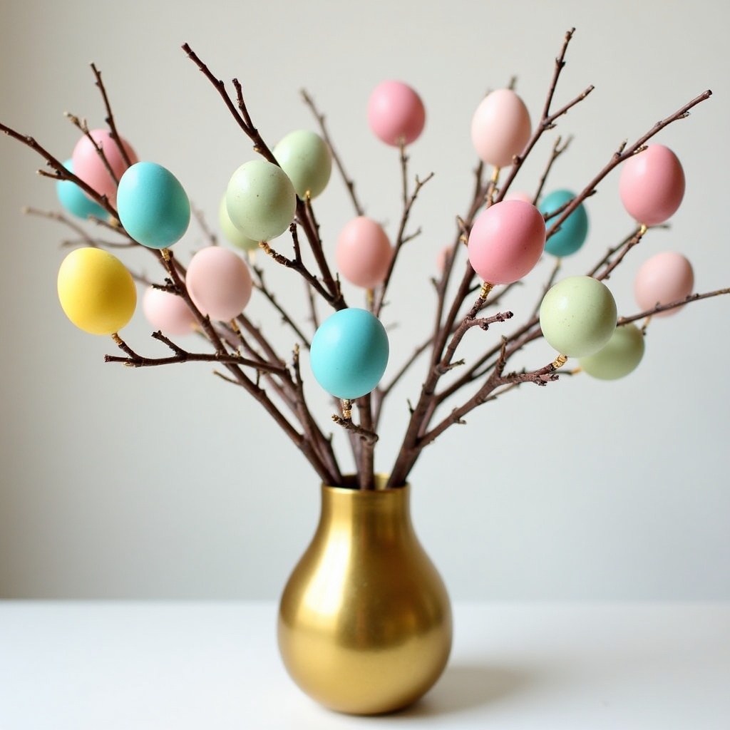 A vase holds branches with colorful eggs attached. This decoration showcases pastel colors for a festive look around Easter time.