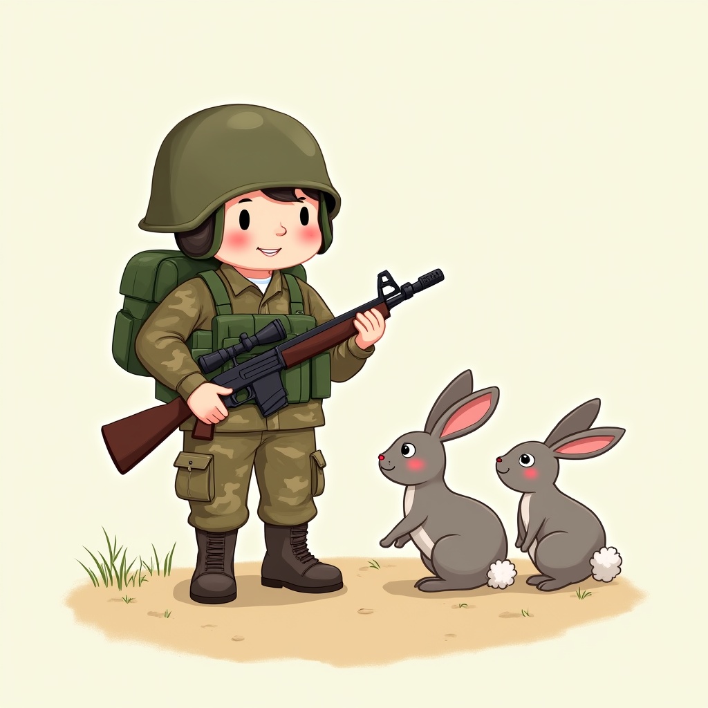 adventure, animals, cartoon, character, childhood, companionship, curious, field, grass, innocence, military, nature, outdoor, peaceful scene, playfulness, rabbits, rifle, soft colors, soldier, wildlife