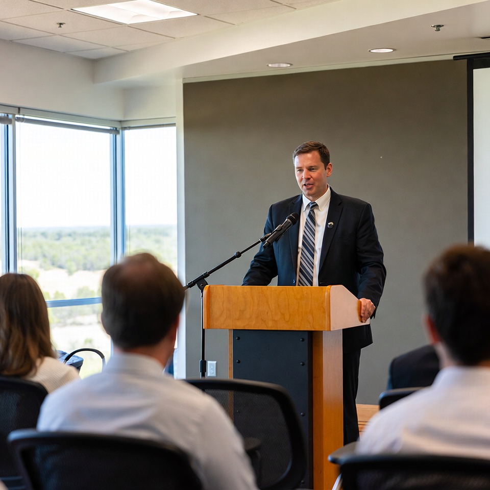 A man stands at a podium speaking to an audience during a conference in an office setting. Sunlight comes through large windows.