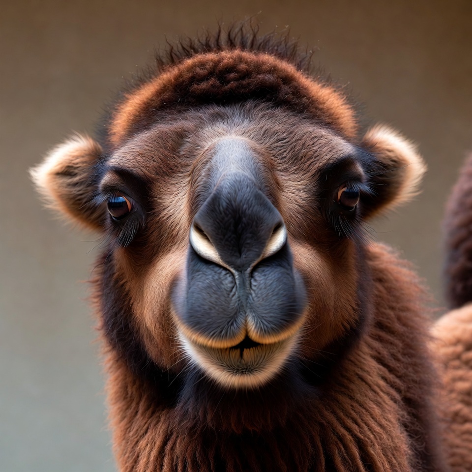 A camel stands still, staring straight ahead with its large eyes and soft fur visible.