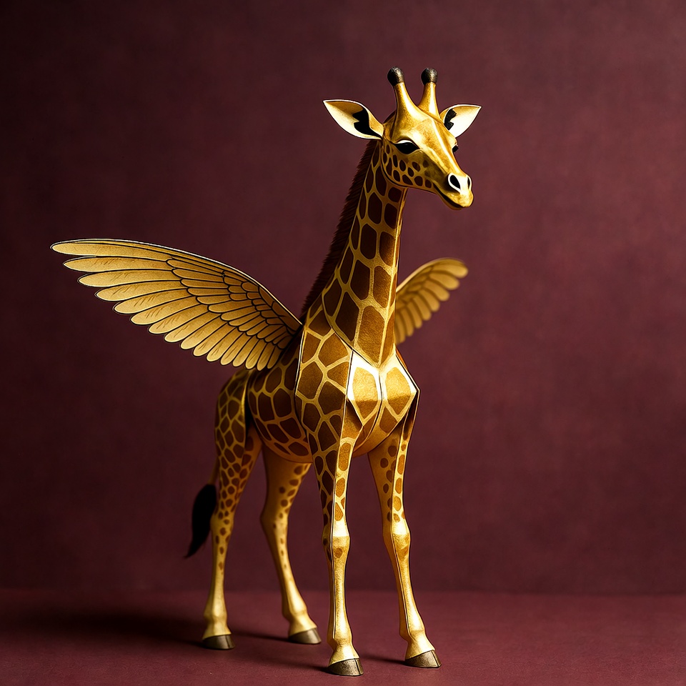 A giraffe with wings stands posed against a dark red background. The figure shows intricate details and vibrant colors.