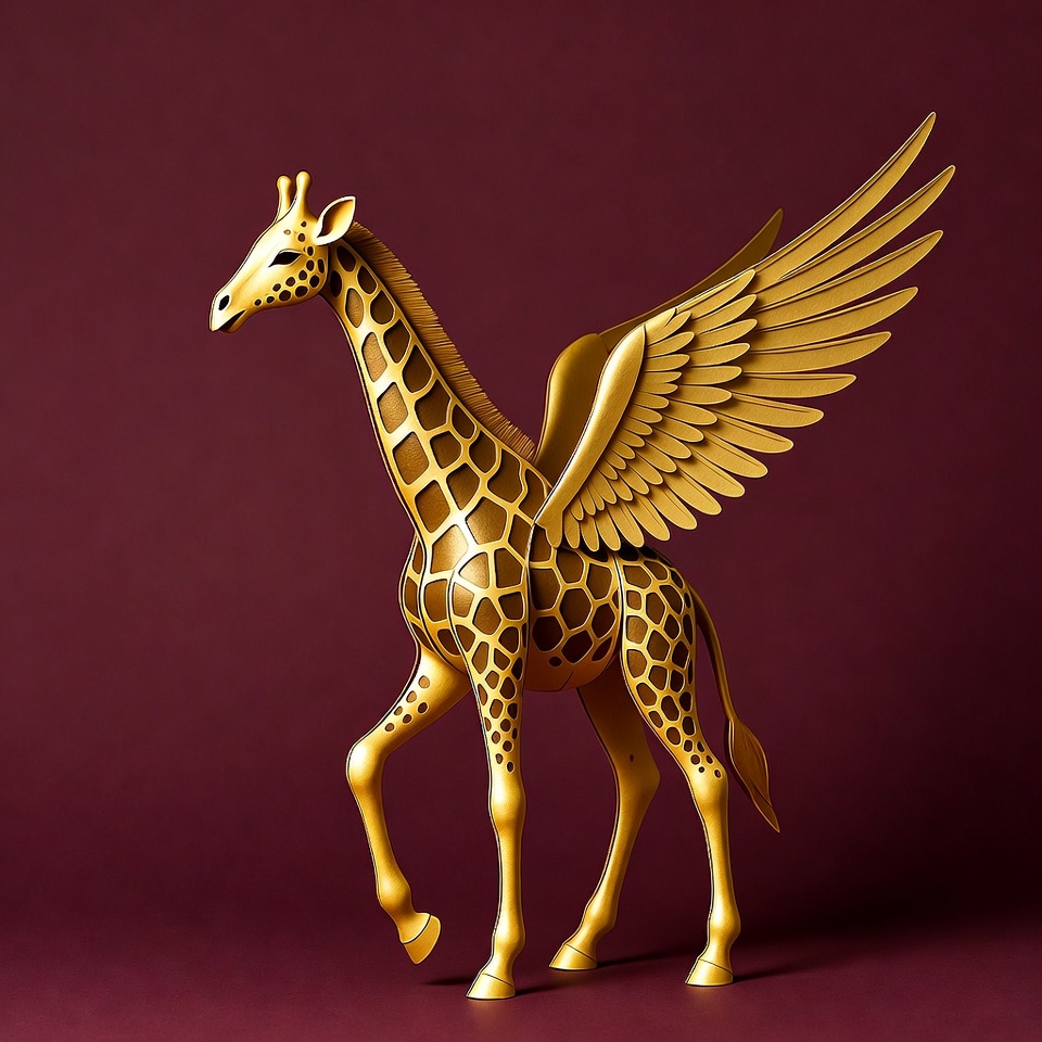 aesthetic, animal, art, background, creative, creature, design, detail, display, fantasy, flying, giraffe, golden, handcrafted, inspiration, model, sculpture, unique, visual, wings
