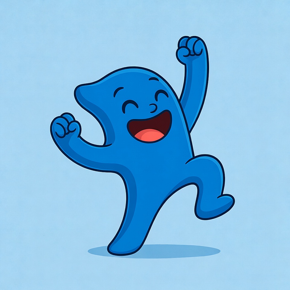 A cheerful blue character is jumping with joy, arms raised and smiling. The character is set against a plain blue background.
