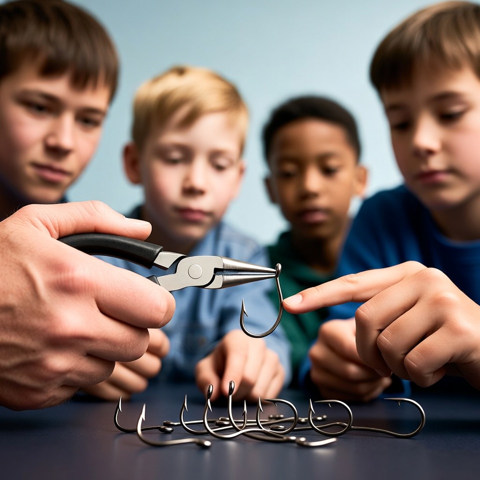 Four boys gather around a table to learn about fishing hooks. One boy holds pliers while others watch closely and learn.