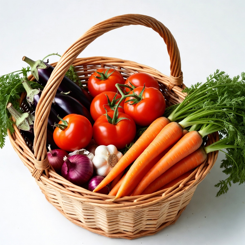 A basket holds a variety of vegetables including carrots, tomatoes, garlic, and onions. It is set against a plain background.