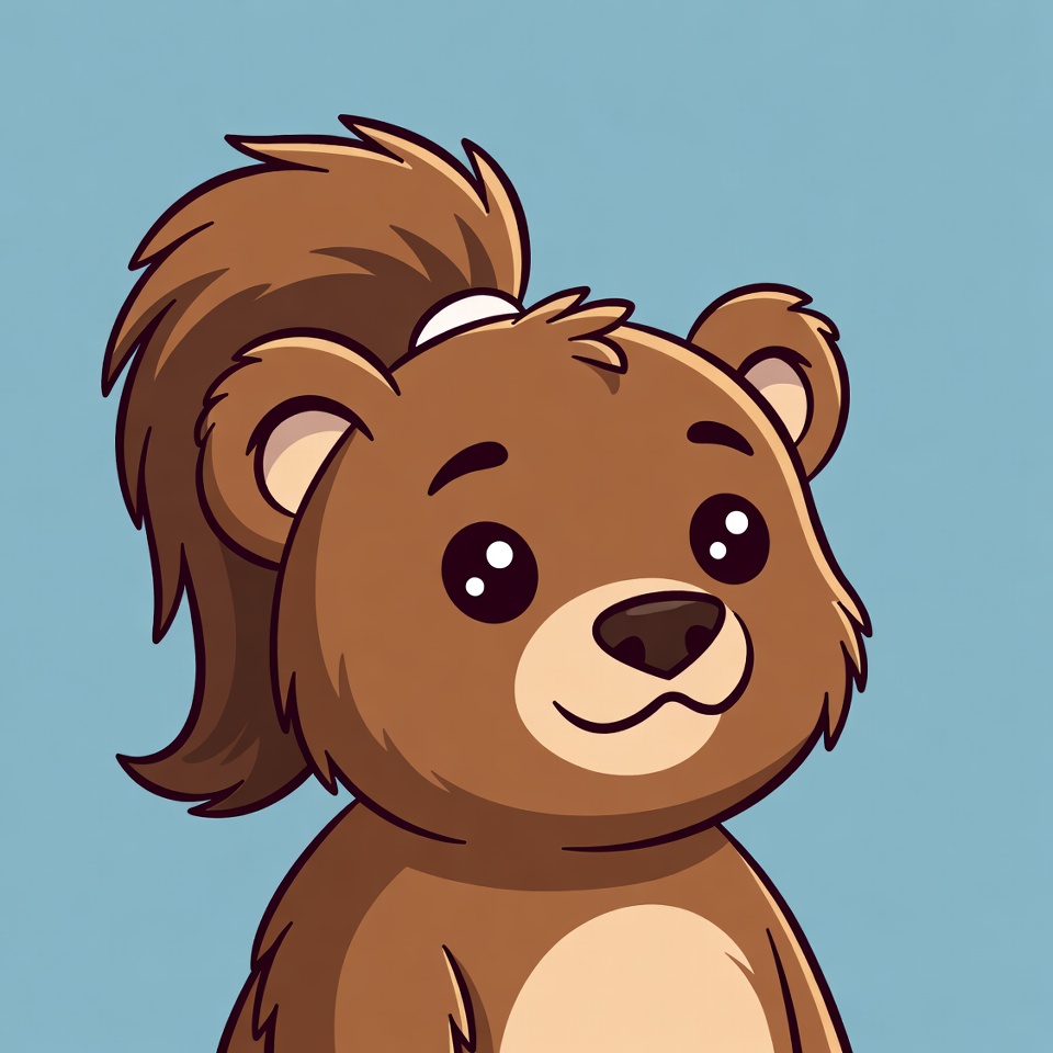 A bear character stands with a friendly expression. The bear has a ponytail and looks cheerful against a blue background.
