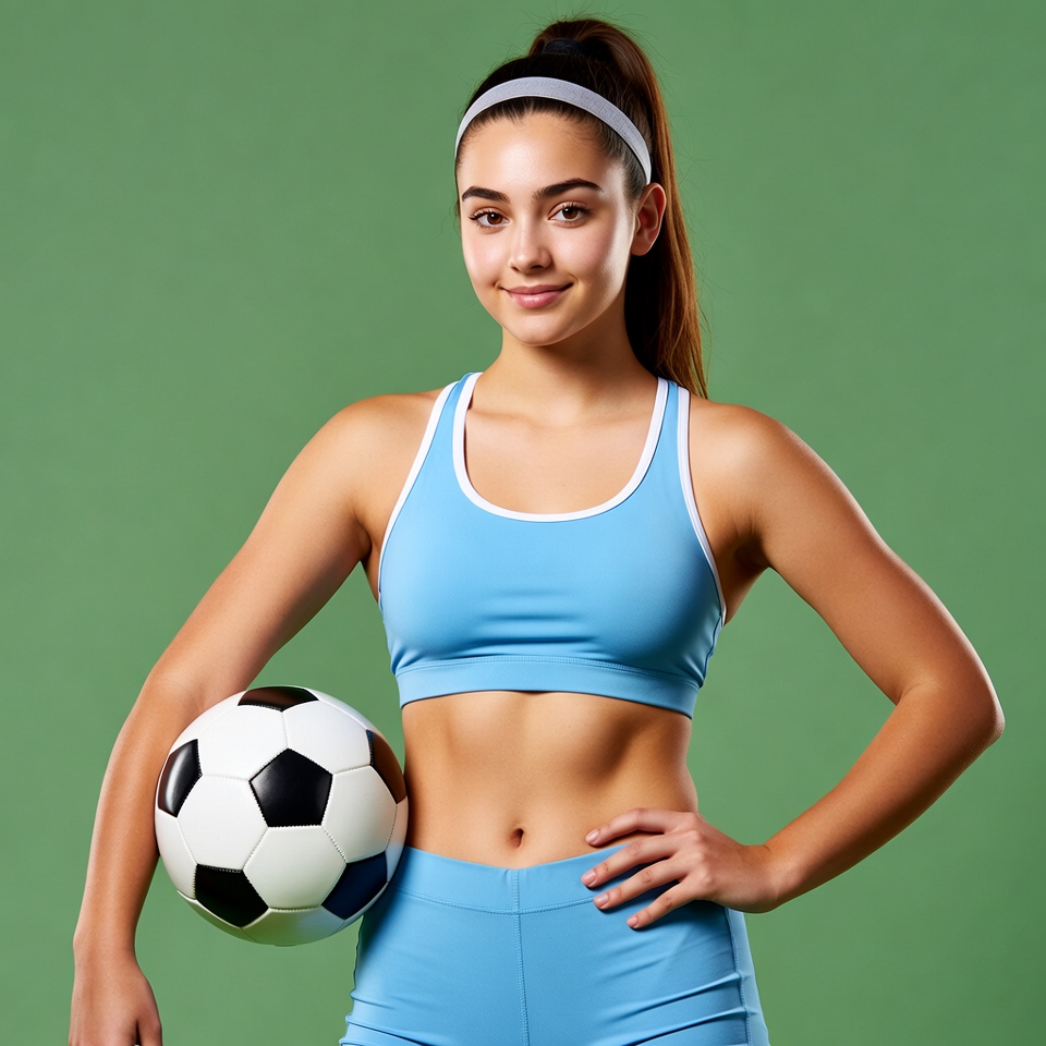 A young female athlete stands confidently with a soccer ball. She wears a blue sports outfit and has long hair in a ponytail.