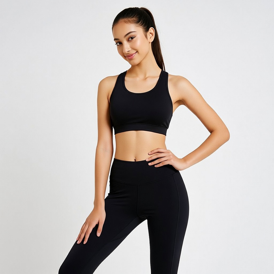 activewear, athletic, black, casual, confidence, exercise, fashion, fitness, health, indoor, lifestyle, model, outfit, pose, smile, standing, studio, styling, trendy, woman