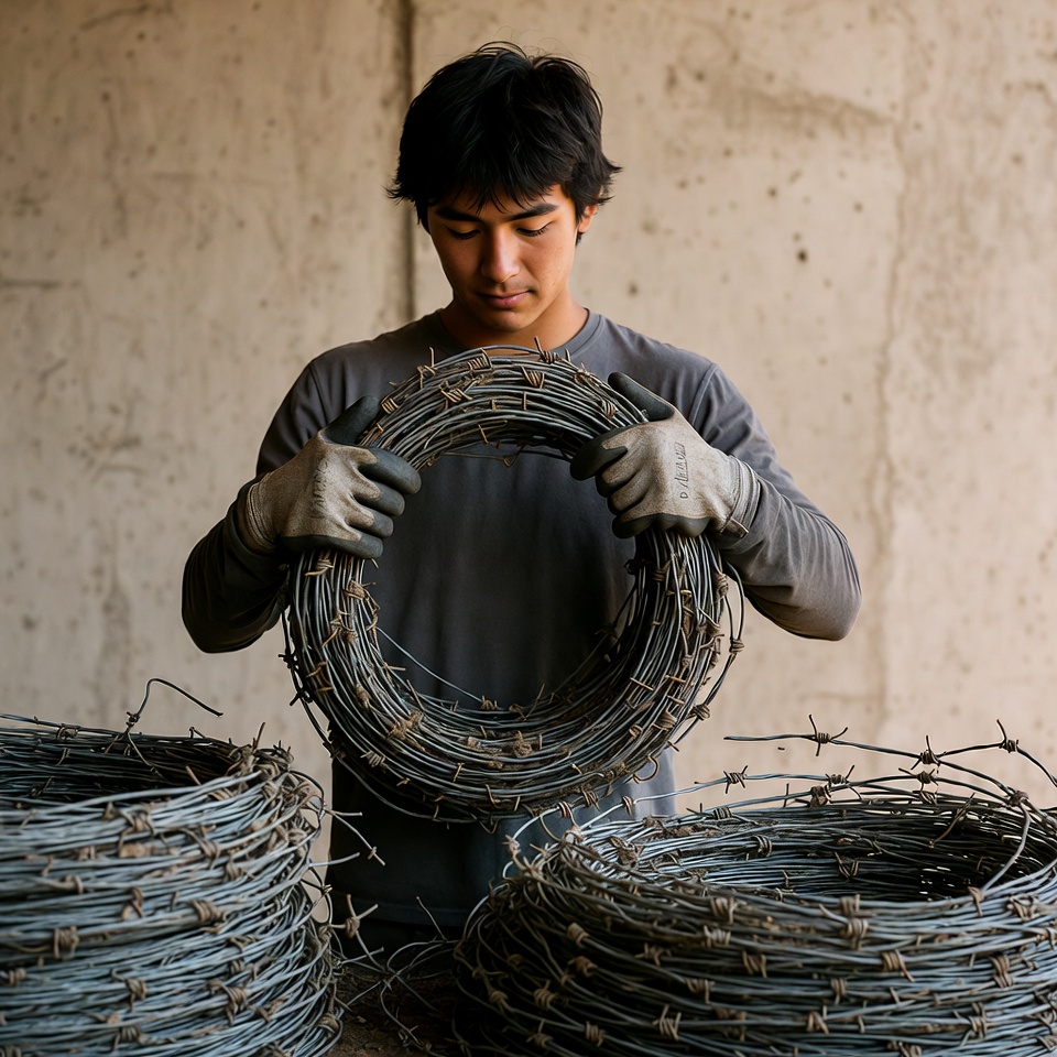 Young man arranges coils of barbed wire in workshop. He shows focus on task while wearing gloves and standing by stacked wire.