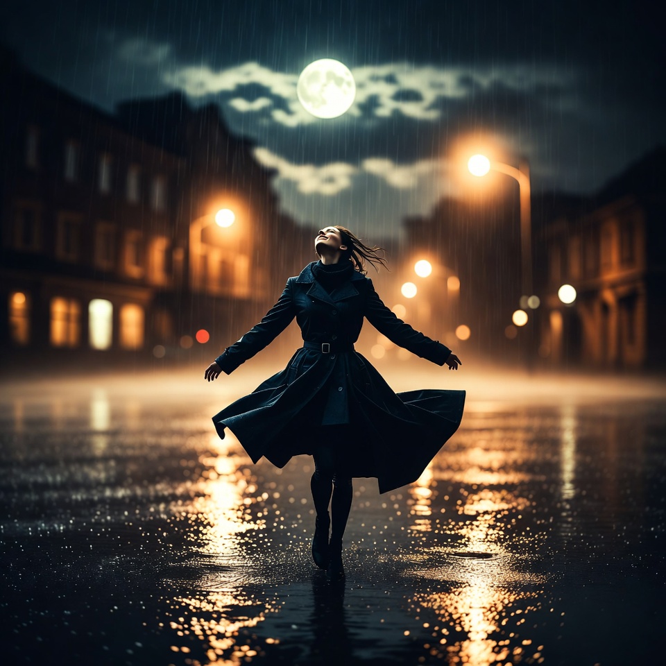 alone, city, coat, fashion, freedom, full moon, happiness, illuminated, joy, night, outdoor, rain, silhouette, street, streetlight, urban, walking, water, wet, woman