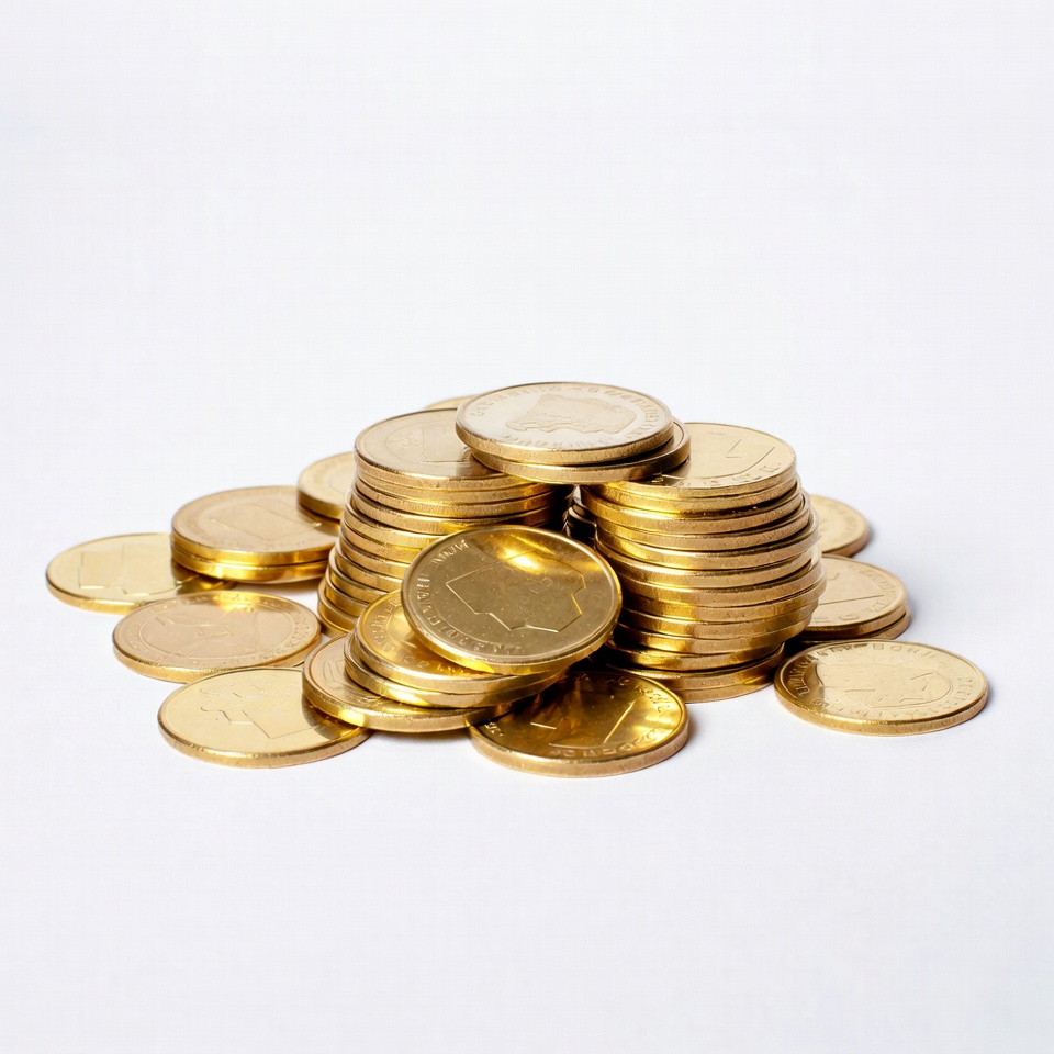 Gold coins are stacked in various layers, forming a tall heap on a white background. The coins are shiny and appear new.