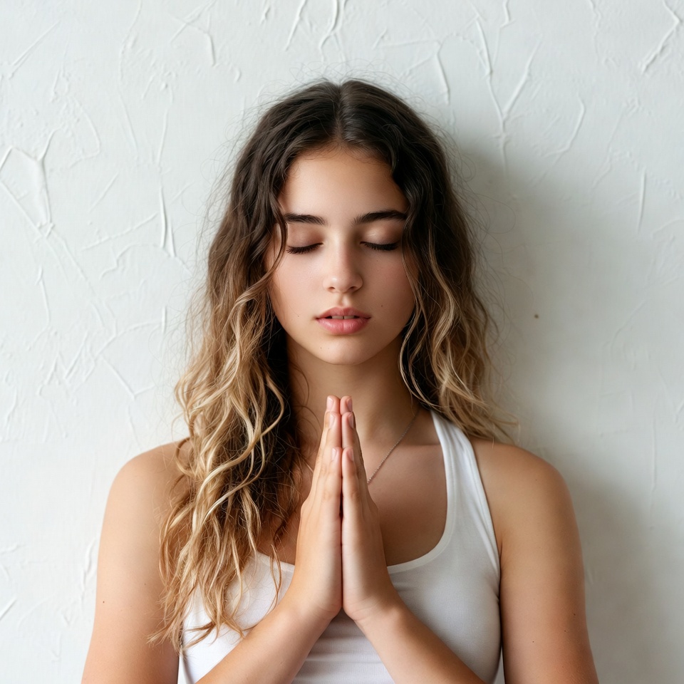 breathing, calmness, closed eyes, connection, focus, hair, hands together, indoors, meditation, mindfulness, moment, peace, practice, quiet, self-care, stillness, texture, wall, woman, young