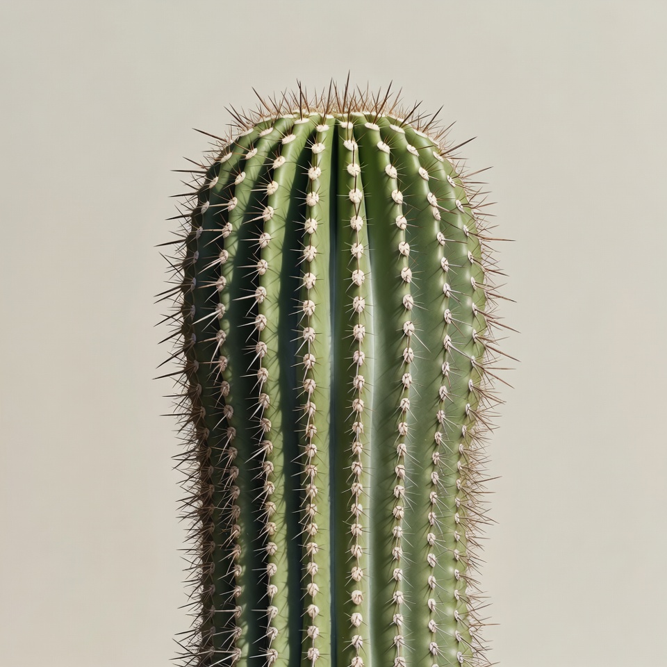 A tall saguaro cactus stands against a plain background. The cactus shows its tall, vertical structure and sharp spines.
