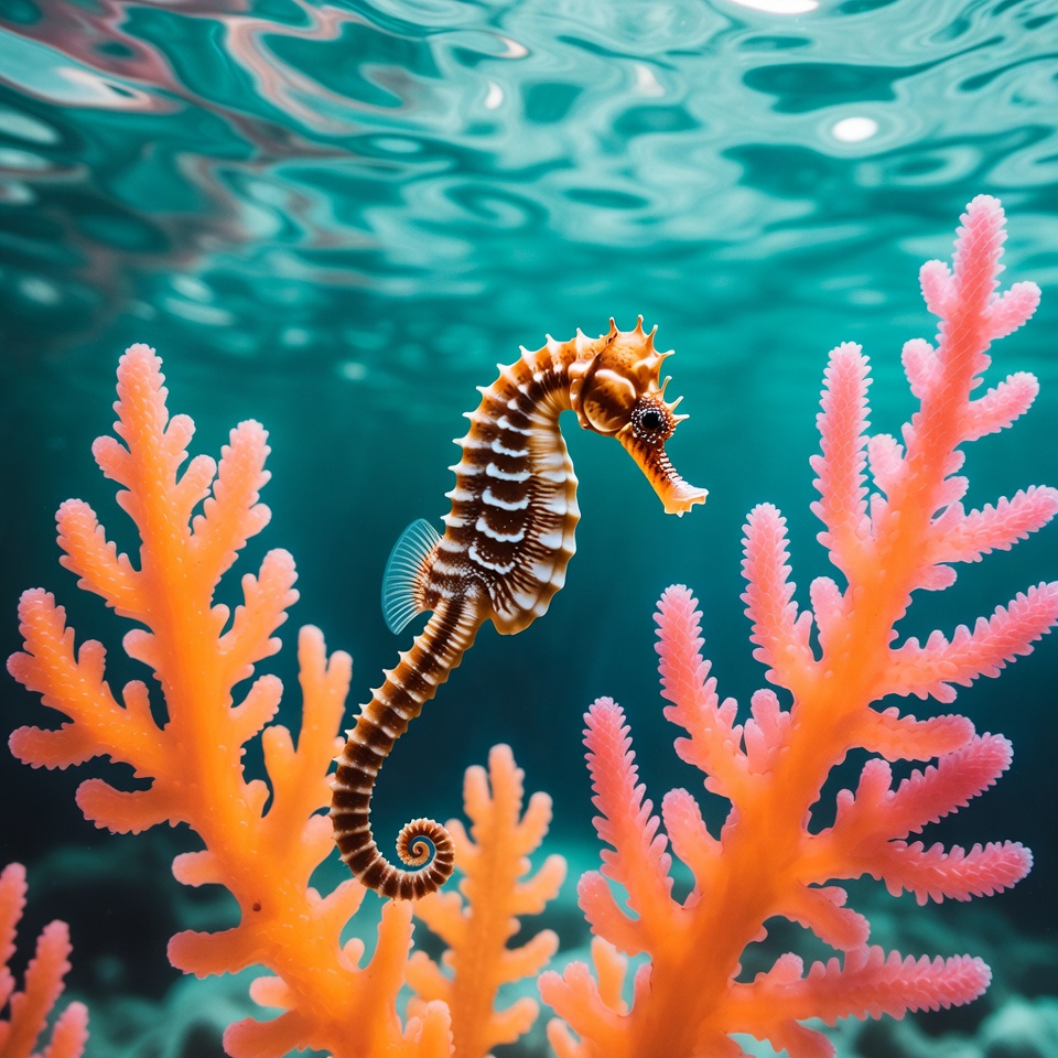 A seahorse swims gracefully among vibrant coral in a clear ocean. Sunlight filters through the water creating a beautiful scene.