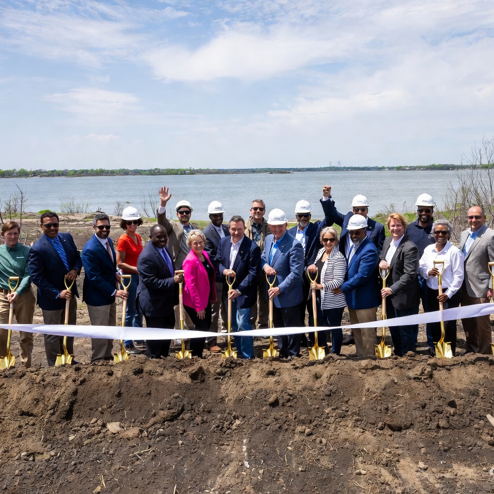 celebration, ceremony, community, construction, event, gathering, groundbreaking, group, lake, large, leaders, lunch, officials, outdoors, people, planning, project, shovels, sky, teamwork
