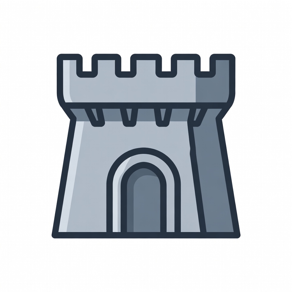 A gray castle tower stands tall with a rounded entrance and battlements. The design lacks intricate details and features a solid appearance.