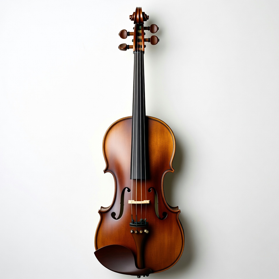 A violin stands upright against a plain wall. It highlights the instrument's curves and craftsmanship. The scene is simple and focused.