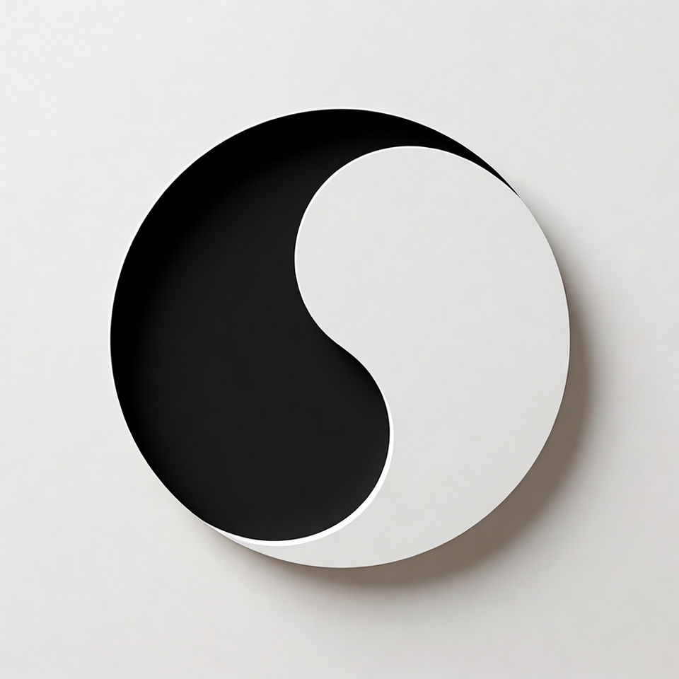 Round object with black and white sections shows a simple design representing yin and yang, emphasizing harmony.